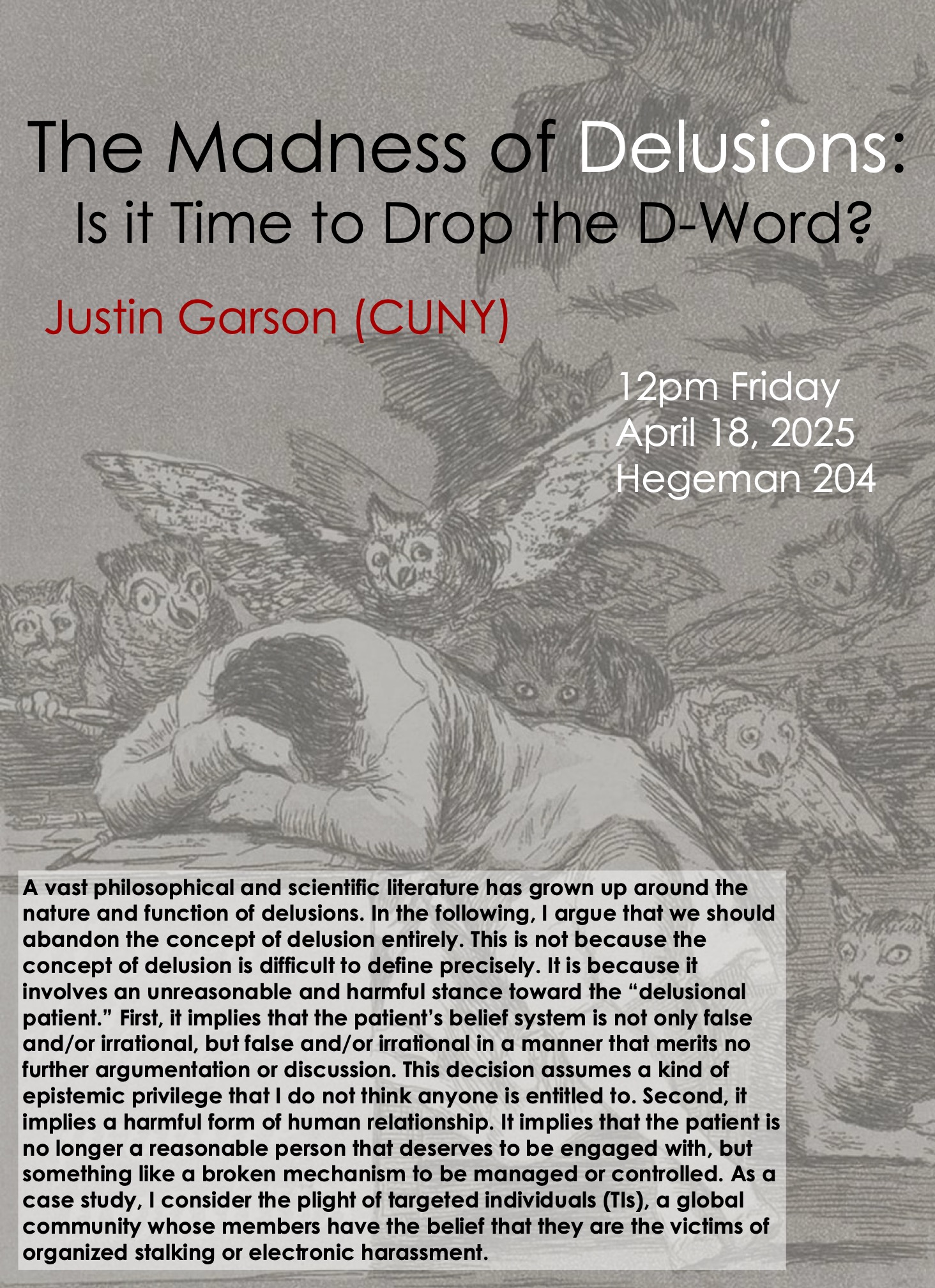 Hegeman 20412:00 pm – 1:30 pm EDT/GMT-4 A vast philosophical and scientific literature has grown up around the nature and function of delusions. Professor Justin Garson will argue in this talk that we should abandon the concept of delusion entirely because it involves an unreasonable and harmful stance toward the “delusional patient.” As a case study, this talk considers the plight of targeted individuals (TIs), a global community whose members have the belief that they are the victims of organized stalking or electronic harassment.